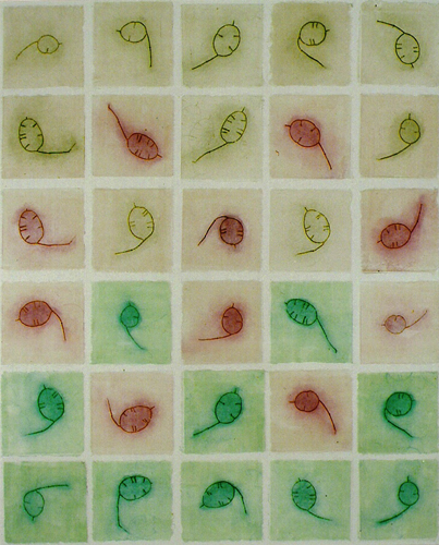 Presto (collezione di lunaria), 30 etchings 10 x 10 cm each, chine collée, 1999