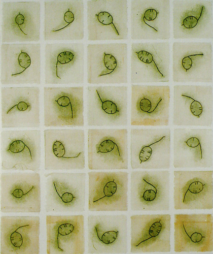 Adagio (collezione di lunaria), 30 etchings 10 x 10 cm each, chine collée, 1999