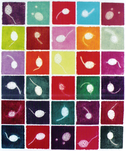Allegro molto e vivace (collezione di lunaria), 30 etchings 10 x 10 cm each, chine collée, 1999